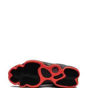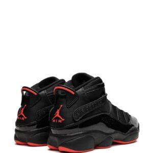 Jordan 6 Rings “Black Infrared” sneakers Michael Jordan wore seven different styles of his signature sneaker while winning six NBA championships with the Bulls – the Air Jordan 6 Rings is a tribute to each championship. Popular and easily recognizable, these high-top sneakers arrive in the “Black Infared” colourway that flaunts signature the Jumpman motif in a bright red hue. Highlights – Black/red – Leather – Patent finish – Panelled design – Drawstring fastening – Logo patch at the tongue – Signature jumpman motif – Pull-tab at the heel – Rubber sole